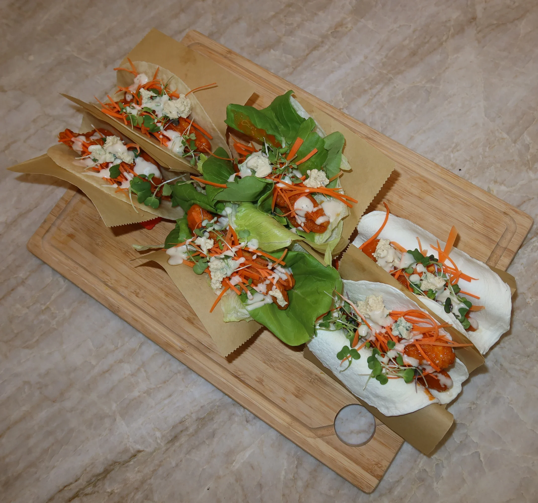 Step 4: Assemble Your Tacos. Lay out your wrap of choice. Add a layer of buffalo chicken.